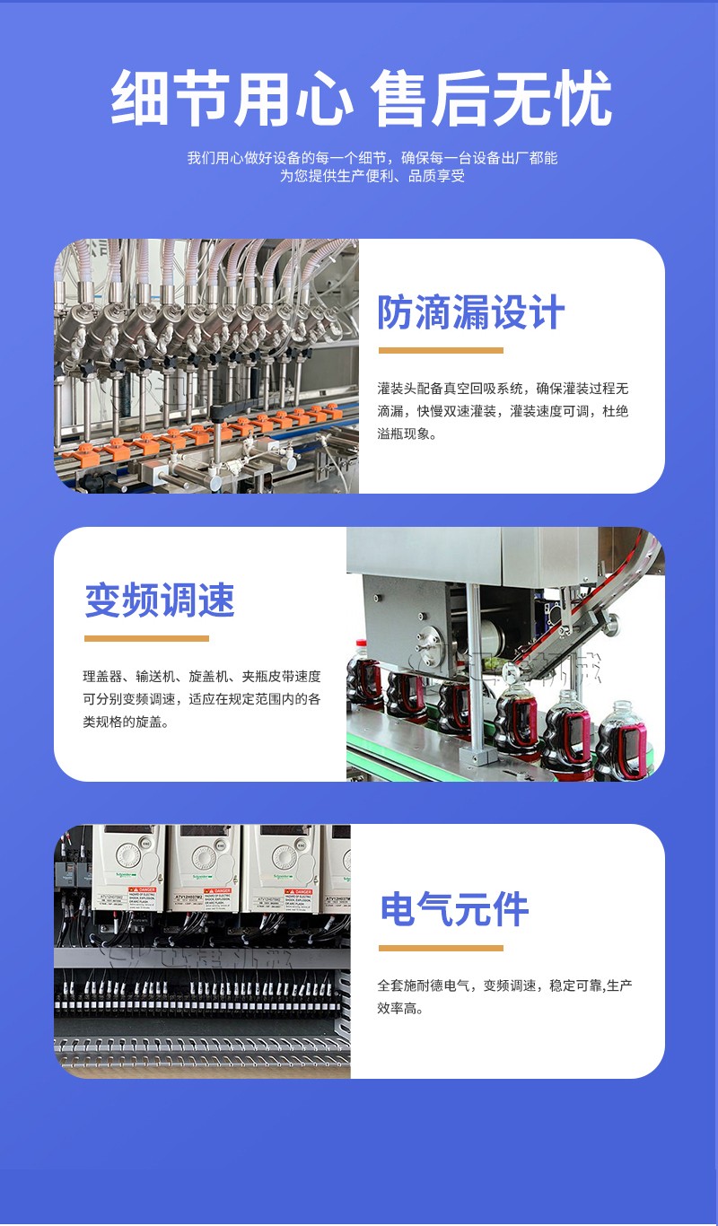 4、定量灌裝,一鍵調節。快速接口易拆易洗,無滴漏下潛灌裝。