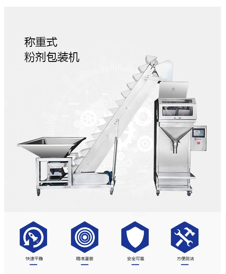 該稱重包裝機適用于農藥、飼料、添加劑、洗衣粉、食鹽、味精、白糖、種子、大米等顆粒粉狀物料的定量稱重包裝。